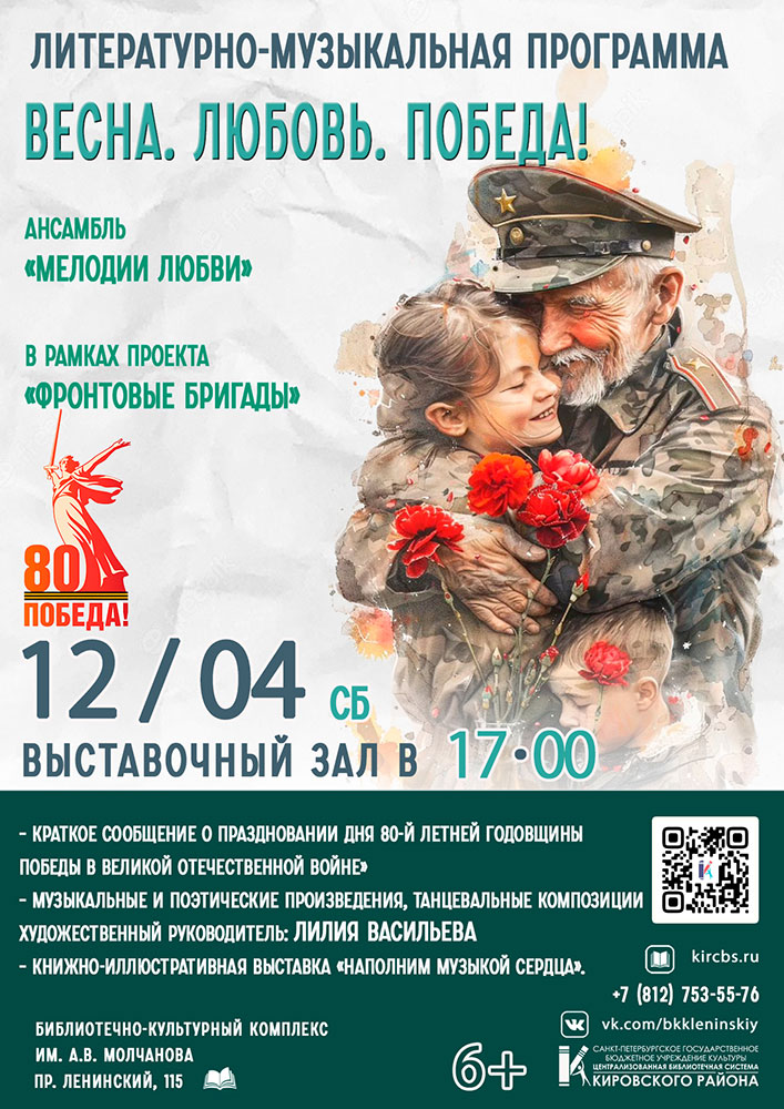 12 апреля в 17.00 в Выставочном зале Библиотечно-культурного комплекса им. А. В. Молчанова (Ленинский пр., д. 115) состоится Литературно-музыкальная программа "Весна. Любовь. Победа!".