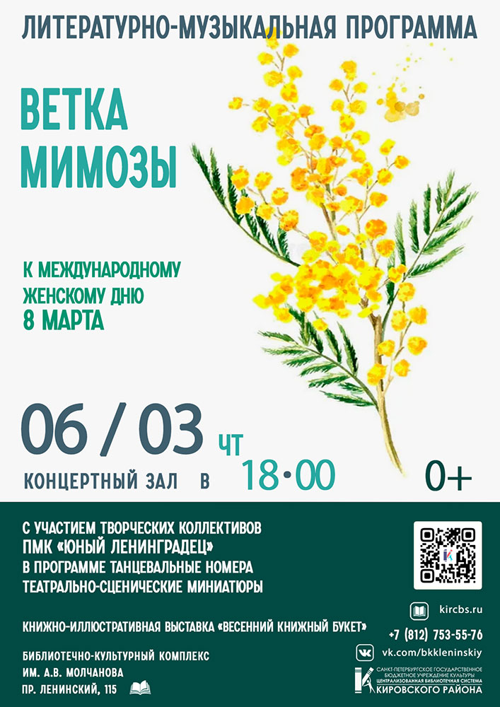 6 марта в 18.00 в Концертном зале Библиотечно-культурного комплекса им. А. В. Молчанова (Ленинский пр., д. 115) состоится Литературно-музыкальная программа "Ветка мимозы".