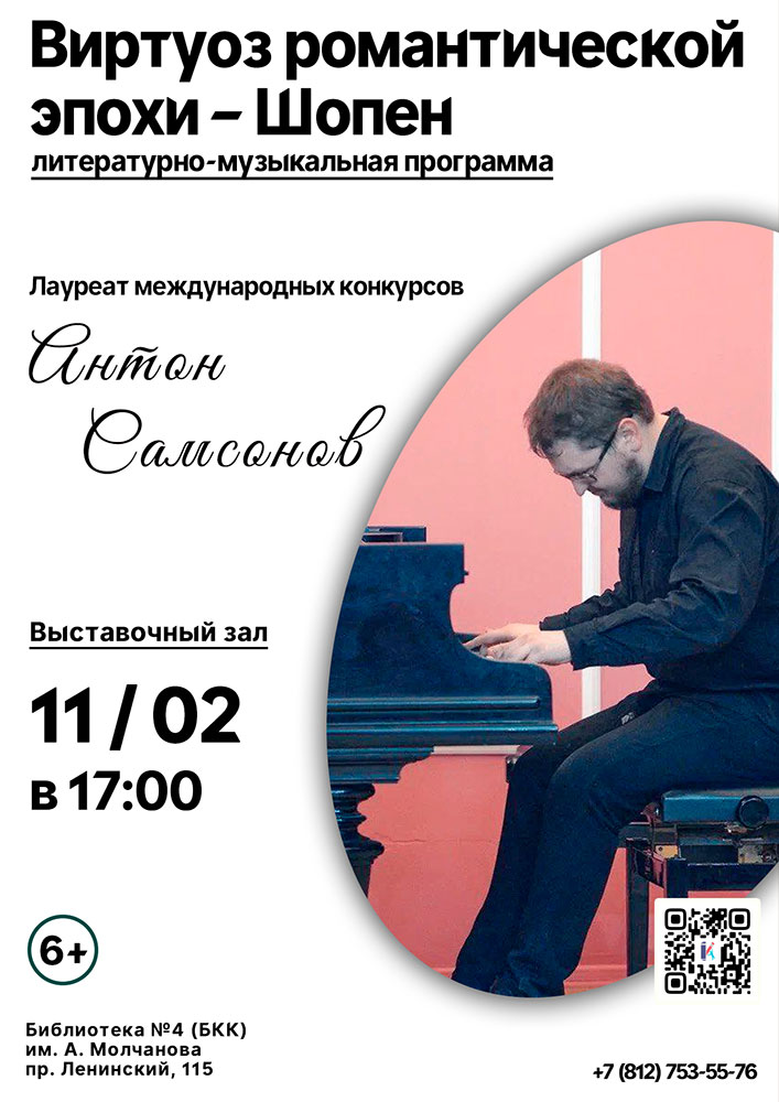 11 февраля в 17.00 в Выставочном зале Библиотечно-культурного комплекса им. А. Молчанова (Ленинский пр., д. 115) состоится Литературно-музыкальная программа "Виртуоз романтической эпохи - Шопен".