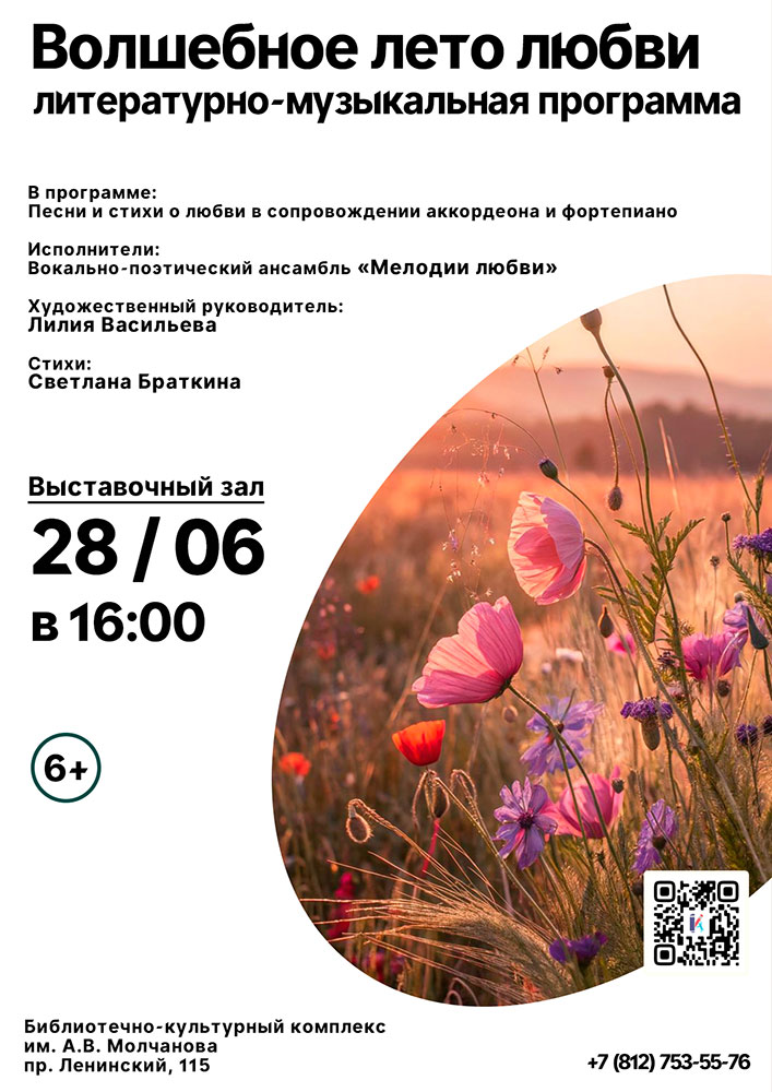 28 июня в 16.00 в Выставочном зале Библиотечно-культурного комплекса им. А. В. Молчанова (Ленинский пр., д. 115) состоится Литературно-музыкальная программа "Волшебное лето любви".
