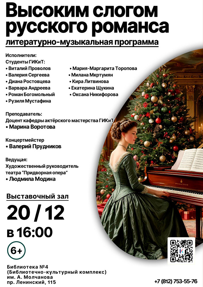 20 декабря в 16.00 в Выставочном зале Библиотеки №4 (Библиотечно-культурного комплекса) им. А. Молчанова (Ленинский пр., д. 115) состоится Литературно-музыкальная программа "Высоким слогом русского романса".