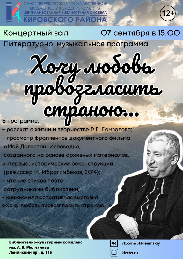 В завершении мероприятия прозвучат стихотворения поэта в исполнении сотрудников библиотеки. Для ценителей творчества Р. Г. Гамзатова будет подготовлена книжно-иллюстративная выставка "Хочу любовь провозгласить страною…"