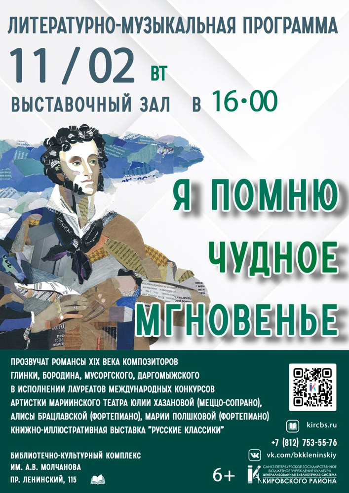 11 февраля в 16.00 в Выставочном зале Библиотечно-культурного комплекса им. А. В. Молчанова (Ленинский пр., д. 115) состоится Литературно-музыкальная программа "Я помню чудное мгновенье".