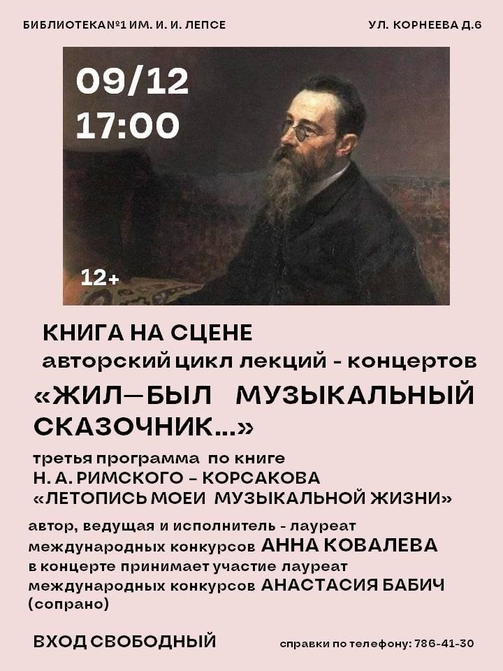 Библиотека №1 приглашает на литературно-музыкальную программу из цикла "Книга на сцене". Для гостей мероприятия прозвучит лекция "Жил-был музыкальный сказочник…" о творчестве Н. А. Римского-Корсакова в исполнении автора проекта, ведущей и исполнителя, Лауреата Международных конкурсов Анны Ковалёвой.
