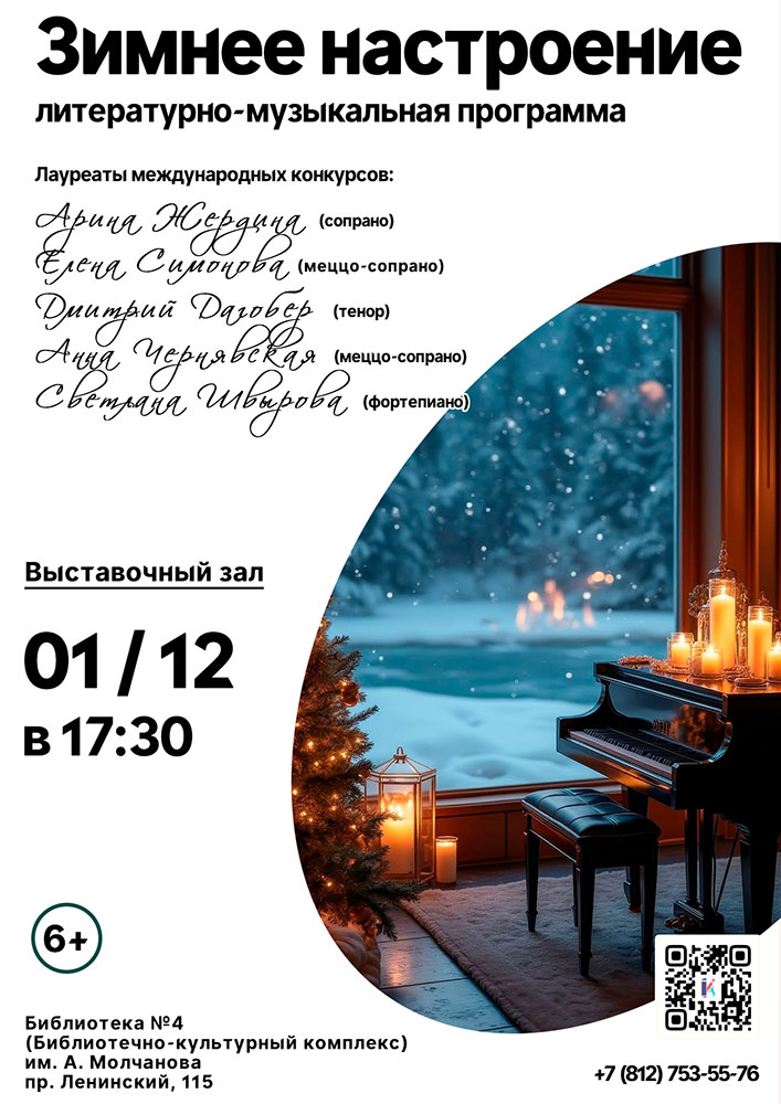 1 декабря в 17.30 в Выставочном зале Библиотеки №4 (Библиотечно-культурного комплекса) им. А. В. Молчанова (Ленинский пр., д. 115) состоится Литературно-музыкальная программа "Зимнее настроение".