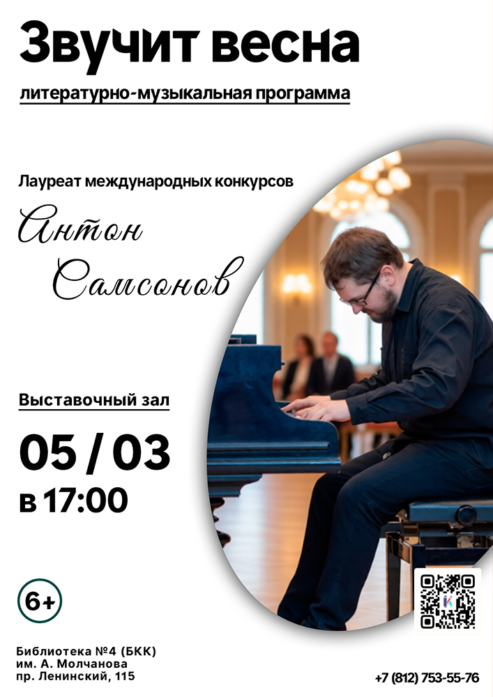 5 марта в 17.00 в Выставочном зале Библиотеки №4 (Библиотечно-культурного комплекса) им. А. В. Молчанова (Ленинский пр., д. 115) состоится Литературно-музыкальная программа "Звучит весна".