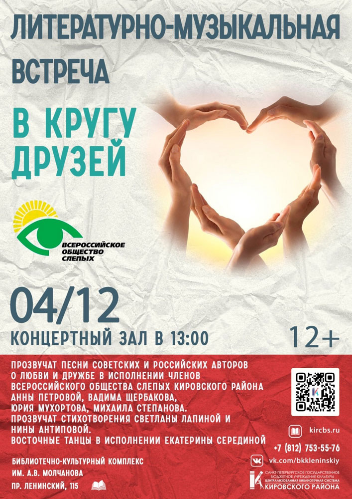 4 декабря в 13.00 в Концертном зале Библиотечно-культурного комплекса им. А. В. Молчанова (Ленинский пр., д. 115) состоится Литературно-музыкальная встреча "В кругу друзей".