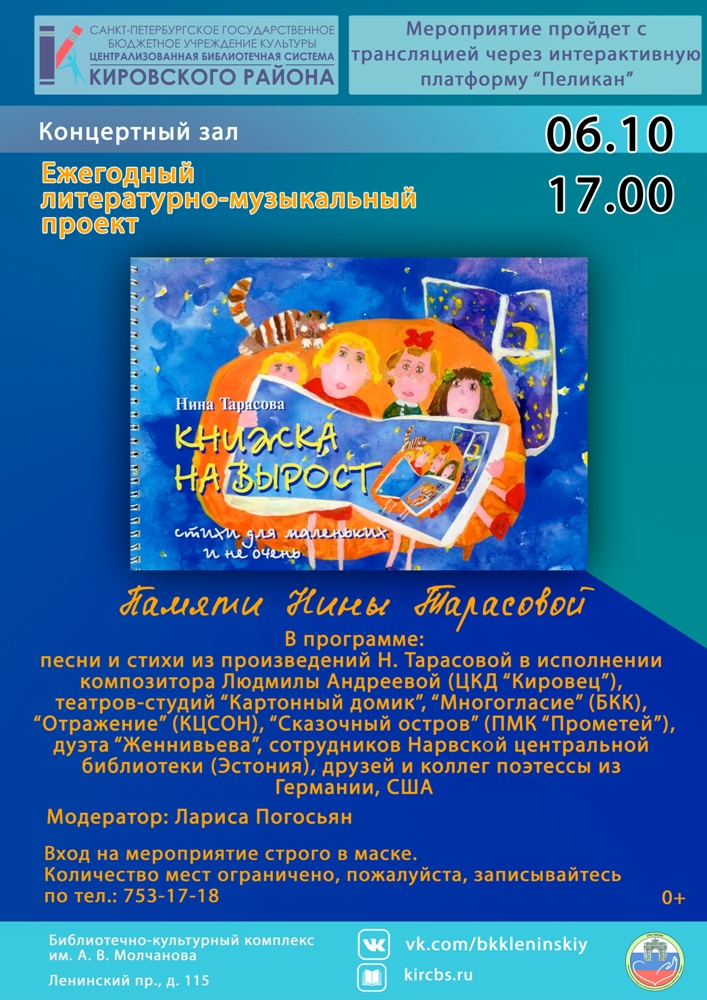 6 октября в 17 часов в концертном зале Библиотеки №4 (Библиотечно-культурный комплекс) им. А. В. Молчанова состоится литературно-музыкальный вечер "Книжка на вырост. Памяти Нины Тарасовой".