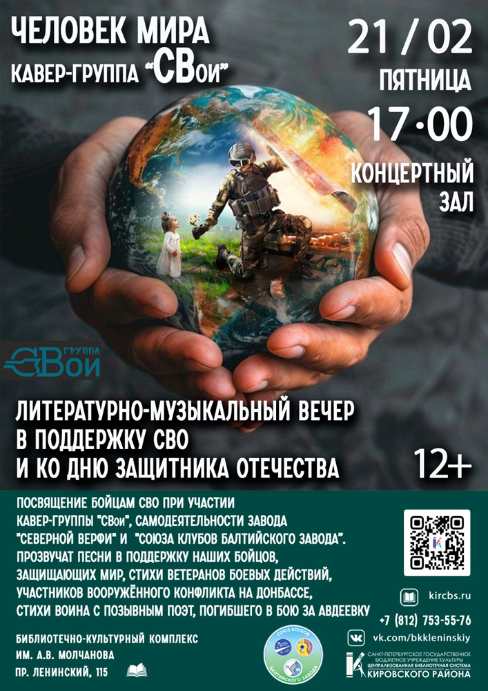 21 февраля в 17.00 в Концертном зале Библиотечно-культурного комплекса им. А. В. Молчанова (Ленинский пр., д. 115) состоится Литературно-музыкальный вечер в поддержку СВО и ко Дню защитника отечества "Человек мира".