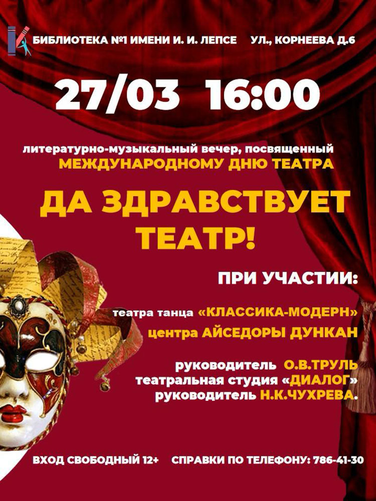 Библиотека №1 им. И. И. Лепсе приглашает всех желающих на Литературно-музыкальный вечер "Да здравствует театр!", посвященный Международному дню театра.