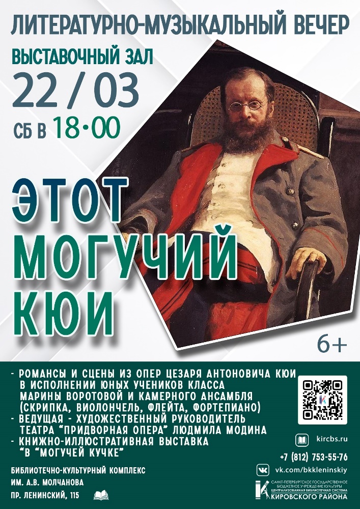 22 марта в 18.00 в Выставочном зале Библиотеки №4/ Библиотечно-культурного комплекса им. А.В. Молчанова (Ленинский пр., д. 115) состоится литературно-музыкальный вечер "Этот могучий Кюи".