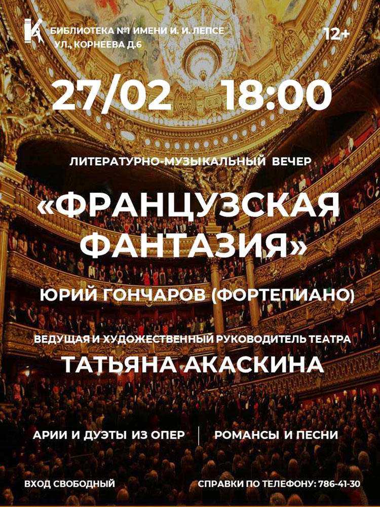Библиотека №1 им. И. И. Лепсе приглашает на Литературно-музыкальный вечер "Французская фантазия".
