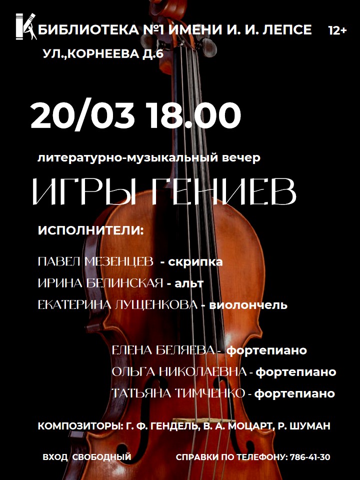 Библиотека №1 им. И. И. Лепсе приглашает на литературно-музыкальный вечер "Игры гениев".