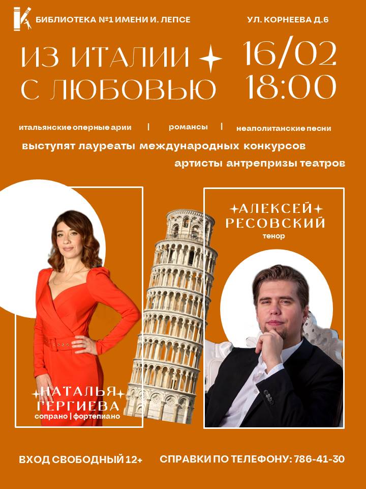 Библиотека №1 имени И. Лепсе приглашает на Литературно-музыкальный вечер "Из Италии с любовью", где выступят лауреаты международных конкурсов и артисты антрепризы театров.