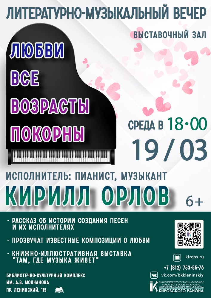 19 марта в 18.00 в Выставочном зале Библиотеки №4/ Библиотечно-культурного комплекса им. А.В. Молчанова (Ленинский пр., д. 115) состоится литературно-музыкальный вечер "Любви все возрасты покорны".