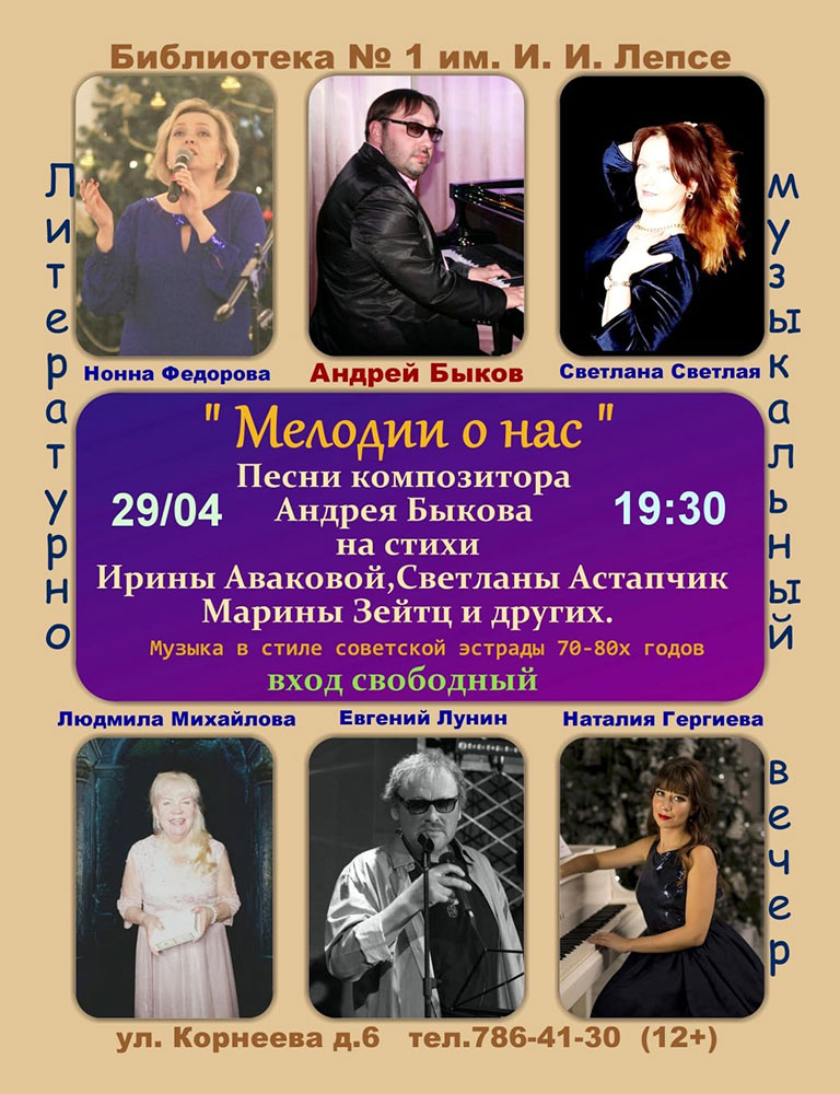 Прозвучат песни композитора Андрея Быкова на стихи Ирины Аваковой, Светланы Астапчик, Марины Зейтц и др.