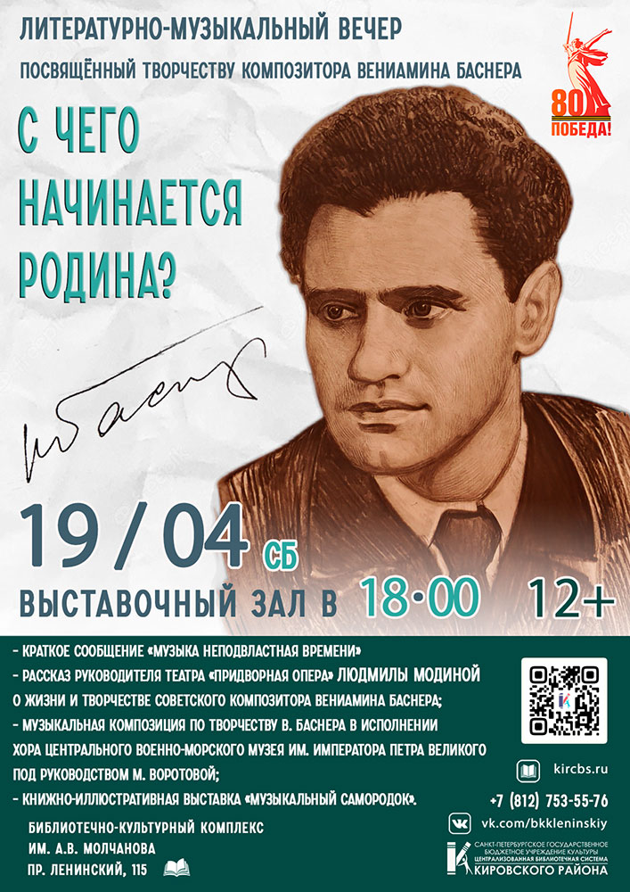 19 апреля в 18.00 в Выставочном зале Библиотечно-культурного комплекса им. А. В. Молчанова (Ленинский пр., д. 115) состоится Литературно-музыкальный вечер по творчеству композитора Вениамина Баснера "С чего начинается Родина?".