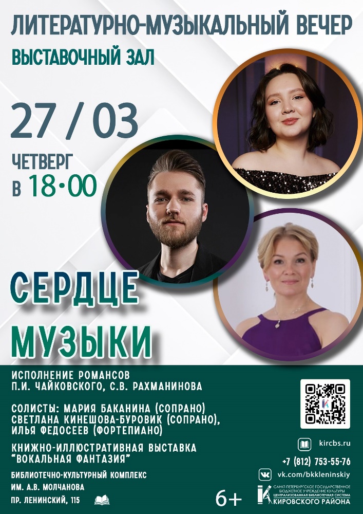 27 марта в 18.00 в Выставочном зале Библиотеки №4/ Библиотечно-культурного комплекса им. А.В. Молчанова (Ленинский пр., д. 115) состоится литературно-музыкальный вечер "Сердце музыки".