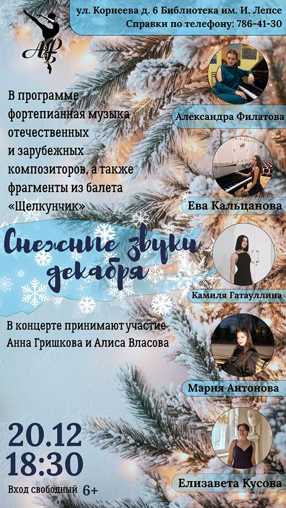В Библиотеке №1 имени И. Лепсе пройдет Литературно-музыкальный вечер "Снежные звуки декабря". В программе: фортепианная музыка отечественных и зарубежных композиторов, а также фрагменты из балета "Щелкунчик".