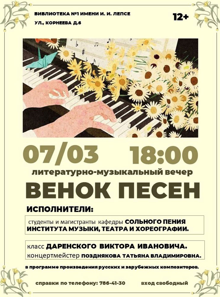 Библиотека №1 им. И. И. Лепсе приглашает на Литературно-музыкальный вечер "Венок песен".