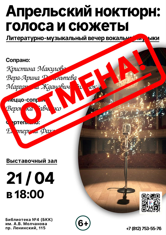 Уважаемые гости! Информируем вас, что Литературно-музыкальный вечер вокальной музыки "Апрельский ноктюрн: голоса и сюжеты", запланированный на 21 апреля в 18.00 в выставочном зале Библиотеки №4 (Библиотечно-культурного комплекса) им. А. В. Молчанова (Ленинский пр., д. 115), отменяется.