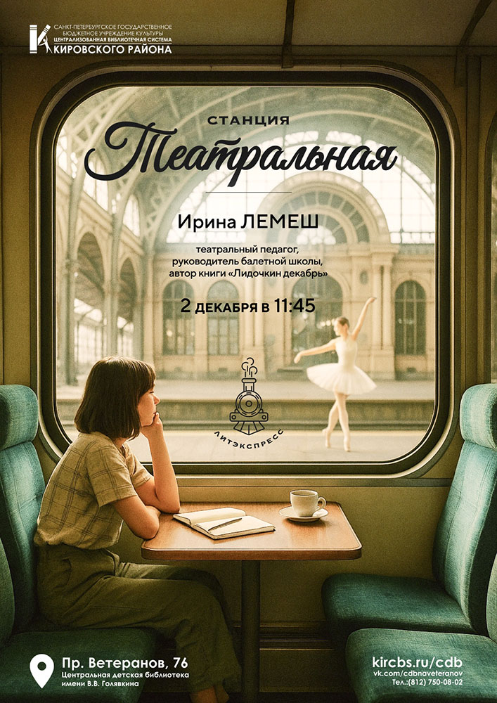 2 декабря в 11.45 в Центральной детской библиотеке им. В. Голявкина (пр. Ветеранов, д. 76) состоится творческая встреча с театральным педагогом Ириной Лемеш.