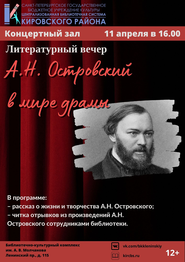 11 апреля в 16.00 в концертном зале Библиотечно-культурного комплекса им. А. В. Молчанова состоится Литературный вечер "А. Н. Островский. В мире драмы".