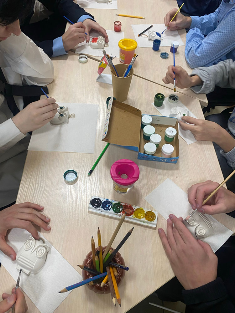 Ребята создавали своих сов и все они получились индивидуальными, несмотря на то, что до "оживления" представляли собой совершенно идентичные детали. Наши юные творцы обратили внимание на этот факт и обсудили его с ведущими: каждый художник оставляет частичку своей личности в произведении.