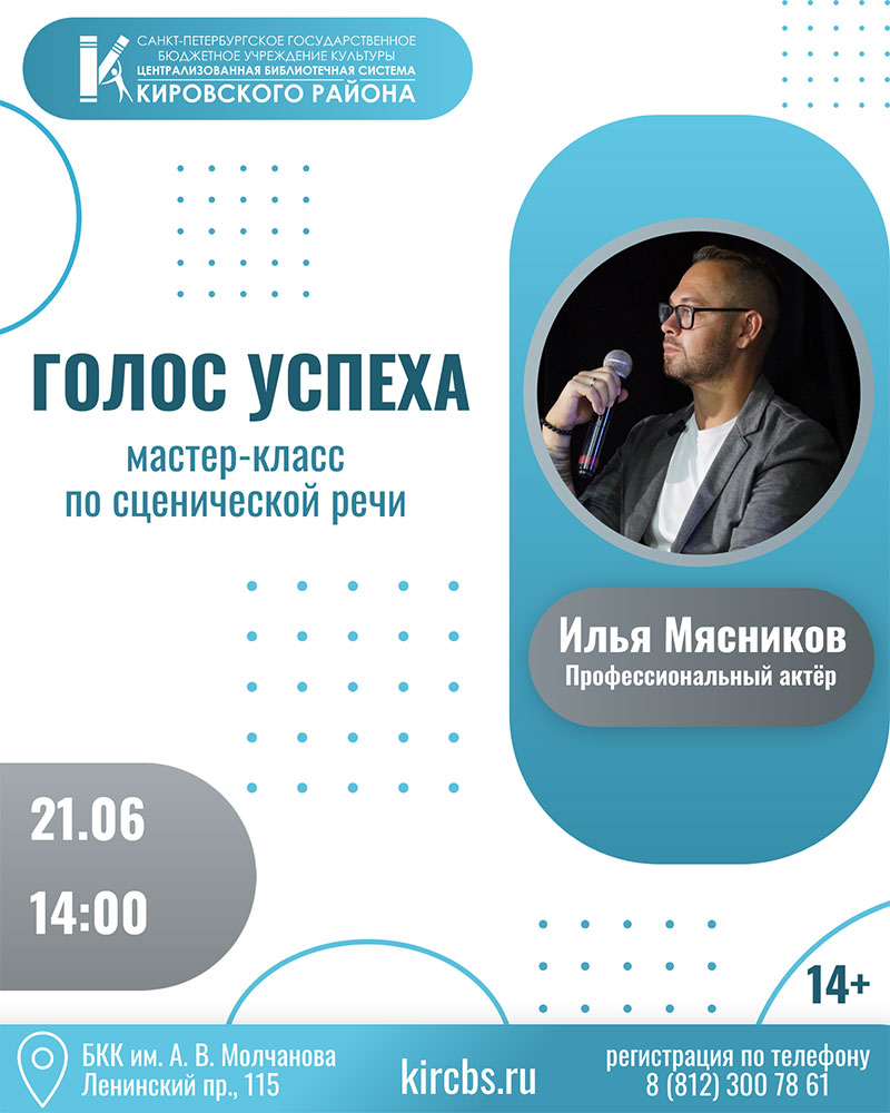 21 июня в 14.00 в Библиотечно-культурном комплексе им. А. В. Молчанова, Ленинский проспект 115, состоится мастер-класс по сценической речи "Голос успеха". Ведущим выступит профессиональный актер, главный администратор Централизованной библиотечной системы Кировского района, СПб, Илья Мясников.