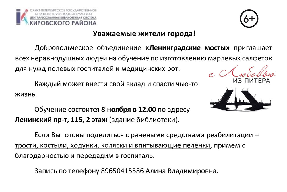 8 ноября в 12.00 в фойе второго этажа Библиотечно-культурного комплекса им. А. В. Молчанова (Ленинский пр., д. 115) состоится Мастер-класс по изготовлению марлевых салфеток для полевых госпиталей и медицинских рот.