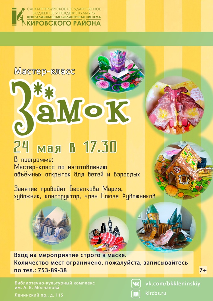 24 мая в 17.30 в Библиотечно-культурном комплексе им. А. В. Молчанова состоится Мастер-класс "Замок" по изготовлению объёмных открыток для детей и взрослых.