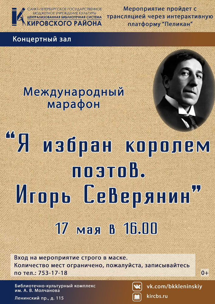 17 мая в 16.00 в концертном зале Библиотечно-культурного комплекса им. А. В. Молчанова состоится Международный марафон "Я избран королем поэтов. Игорь Северянин".