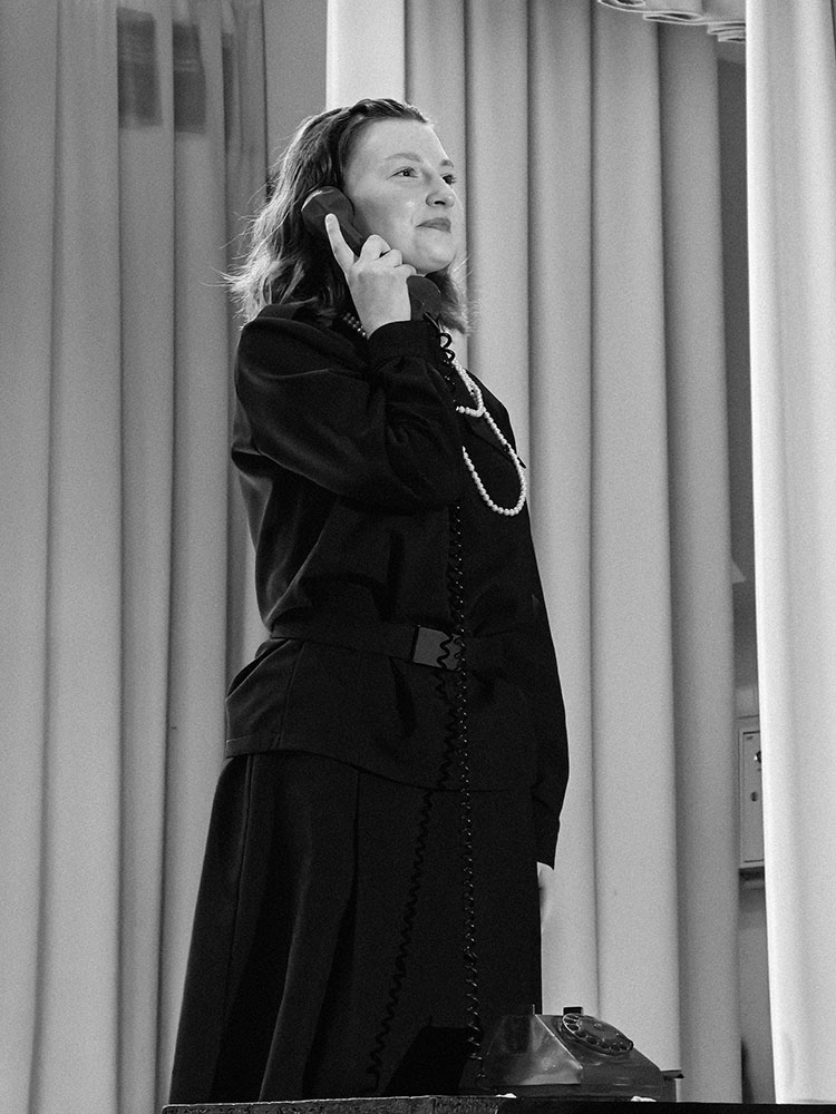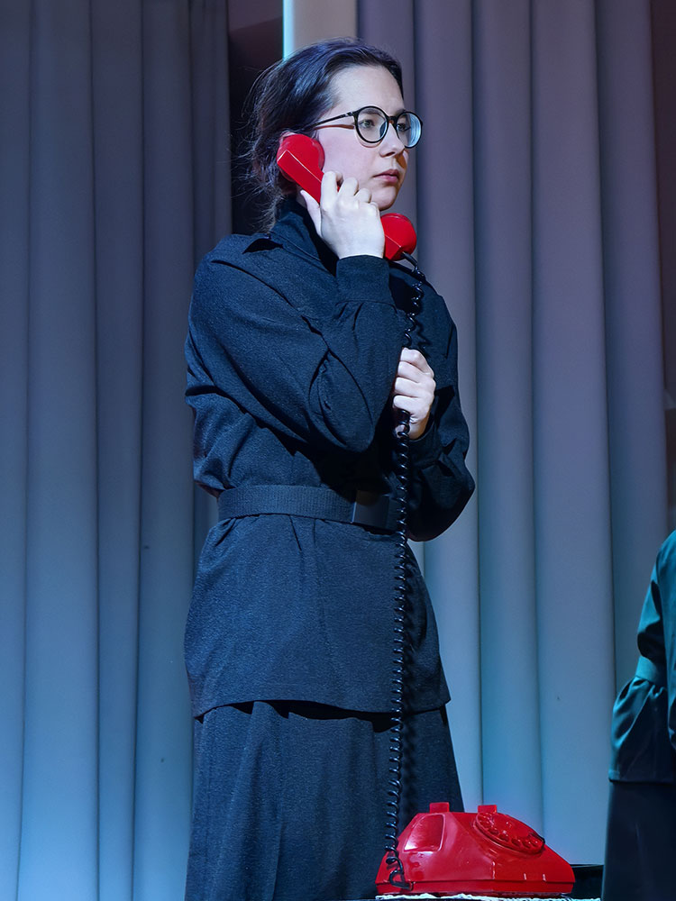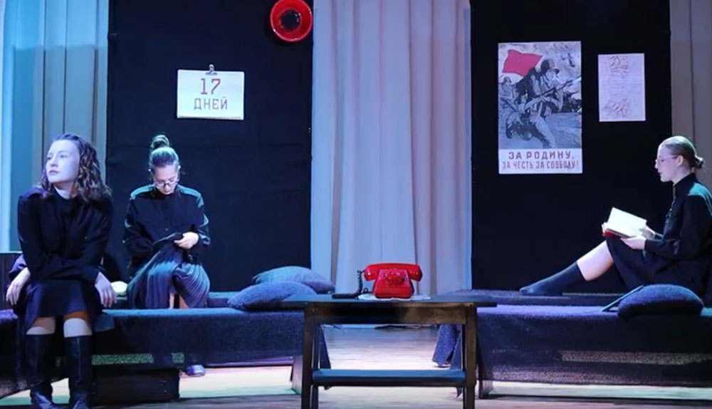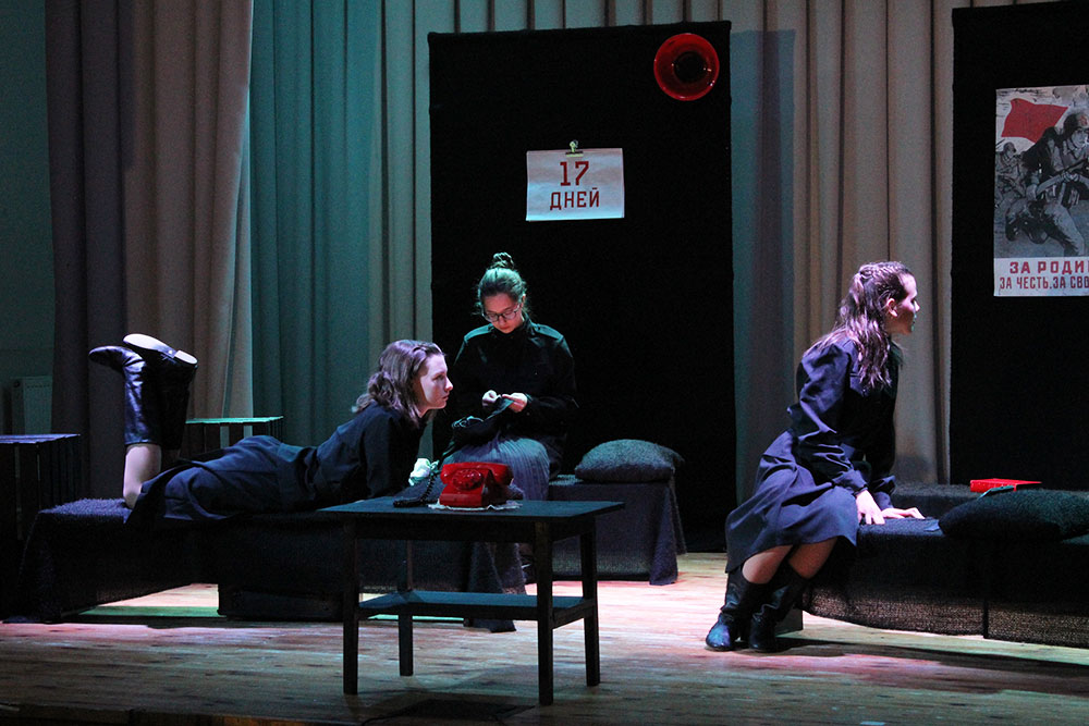 Две ширмы, четыре простых кровати, неброские чемоданы, форма девушек - все это черное, строгое, казарменное. И на их фоне яркими алыми всполохами цвета пролитой крови появляются другие предметы обстановки: телефон, громкоговоритель, книга, письмо, изящные туфельки. Есть ещё один цвет - белый. Но ему нет места в суровые военные времена: он только мелькнёт в букетике полевых цветов, в ночной сорочке, в нарядном платье из прежней, довоенной жизни.
