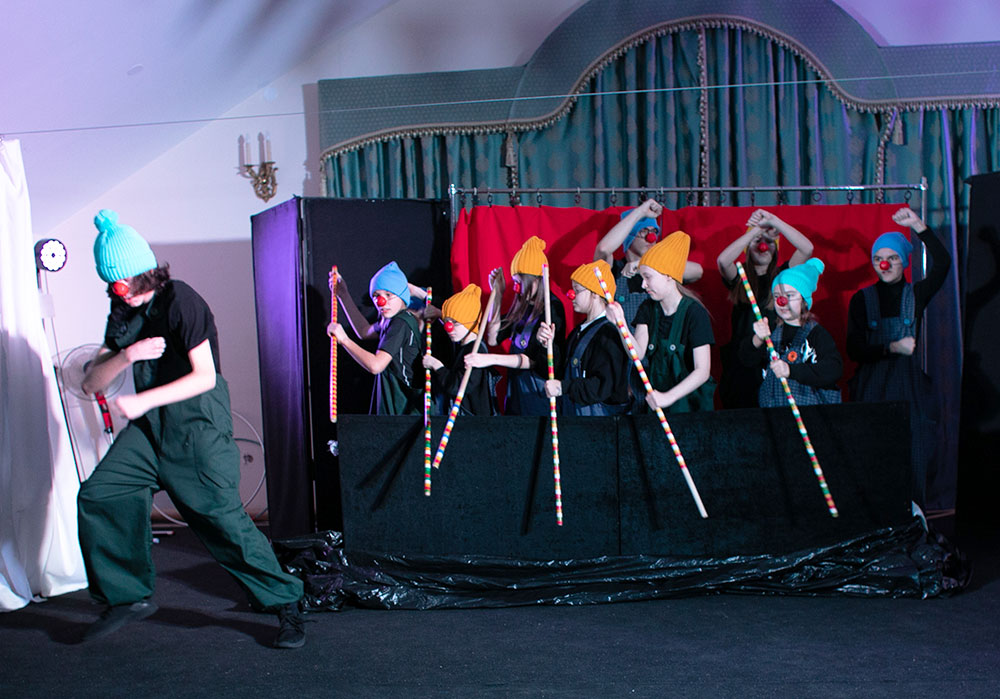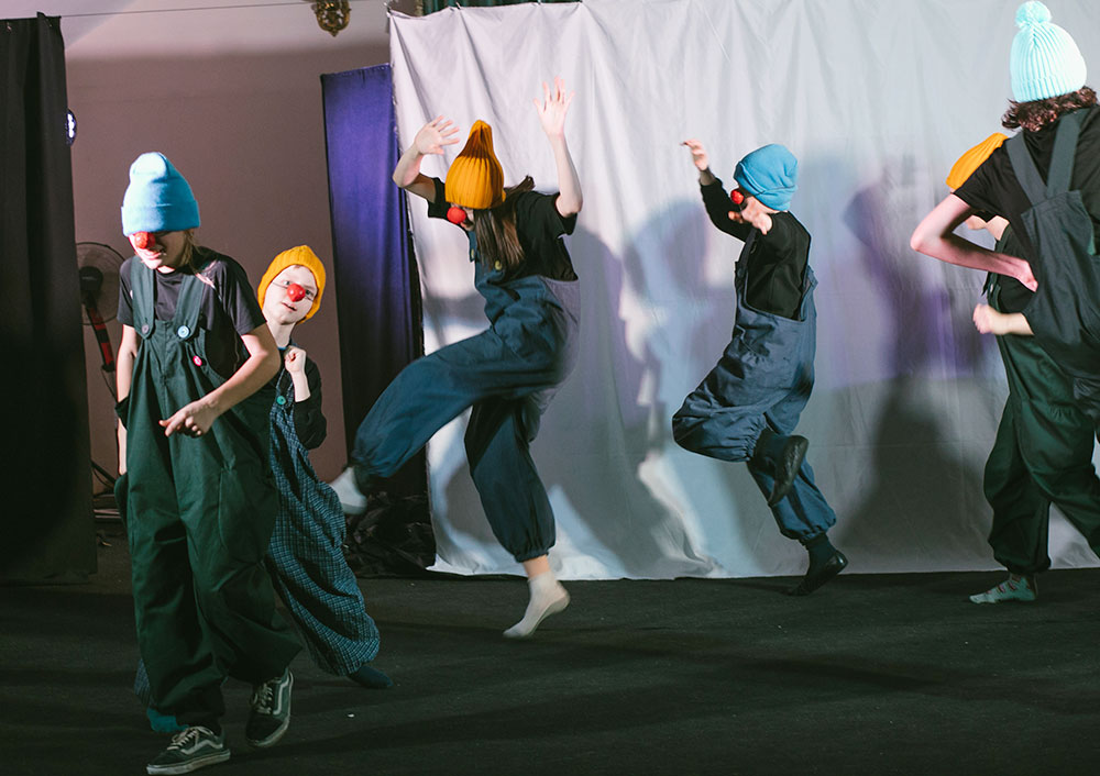 Герои - смешные человечки в клоунских комбинезонах, красных носах и разноцветных шапочках. Юные актёры мастерски владеют пластикой и цирковыми трюками, выполняя все номера с блеском и непосредственностью. Все декорации созданы из подручных средств: картон, полиэтиленовые мешки, разноцветные гетры. На всем отпечаток рукотворности, неслучайности каждой детали. Так же неслучайно в спектакле звучит поэзия: от Бальмонта до Высоцкого. Стихотворные строки поддерживают действие, приходят на помощь в самые трудные минуты.
