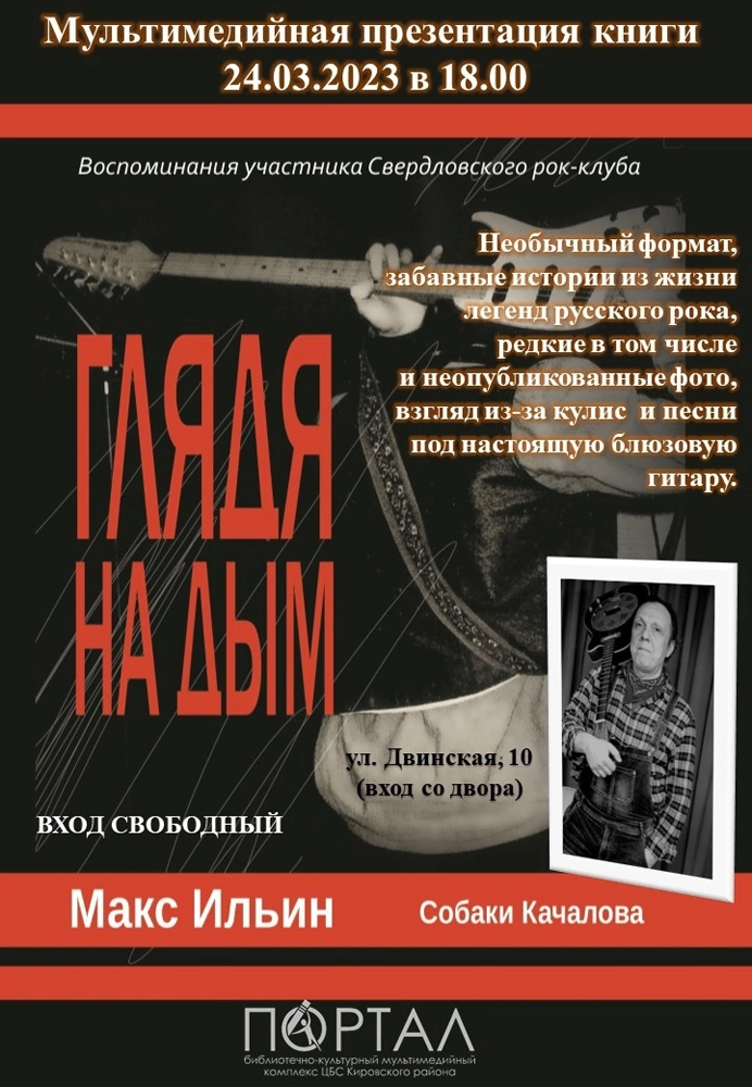 Макс Ильин - лидер группы "Собаки Качалова" представит Мультимедийную презентацию книги "Глядя на дым" - воспоминания участника Свердловского рок-клуба в Мультимедийном библиотечно-культурном комплексе "Портал" (ул. Двинская, д. 10).