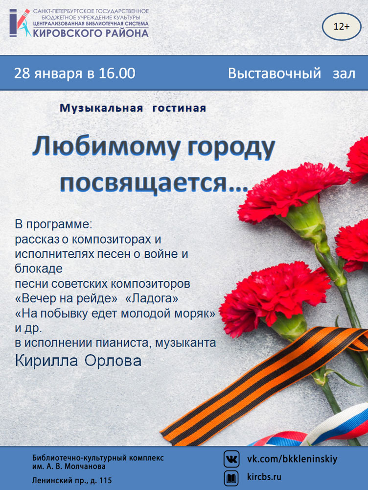 28 января в 16.00 в выставочном зале Библиотечно-культурного комплекса им. А. В. Молчанова состоится Музыкальная гостиная "Любимому городу посвящается...", посвященная годовщине полного освобождения Ленинграда от фашистской блокады в годы Великой Отечественной войны.