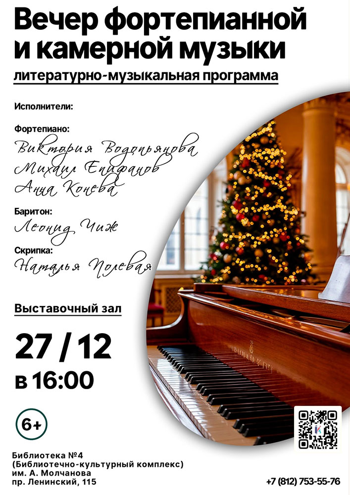 27 декабря в 16.00 в Выставочном зале Библиотеки №4 (Библиотечно-культурного комплекса) им. А. Молчанова (Ленинский пр., д. 115) состоится Литературно-музыкальная программа "Вечер фортепианной и камерной музыки".