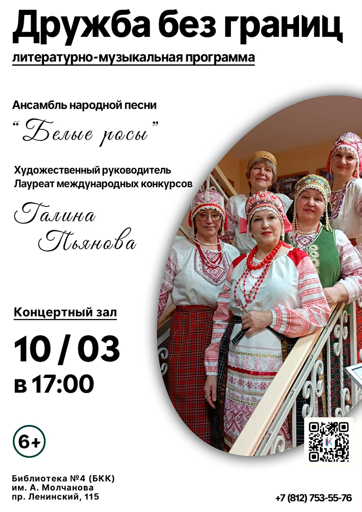 10 марта в 17.00 в Концертном зале Библиотеки №4 (Библиотечно-культурного комплекса) им. А. В. Молчанова (Ленинский пр., д. 115) состоится Литературно-музыкальная программа "Дружба без границ".