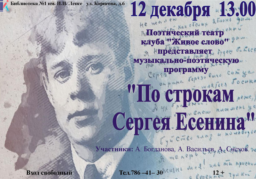 12 декабря Библиотека №1 им. И. И. Лепсе и поэтический театр клуба "Живое слово" приглашает жителей Кировского района на Музыкально-поэтическую программу "По строкам Сергея Есенина" с участием А. Богдановой, А. Васильева, А. Снехова.