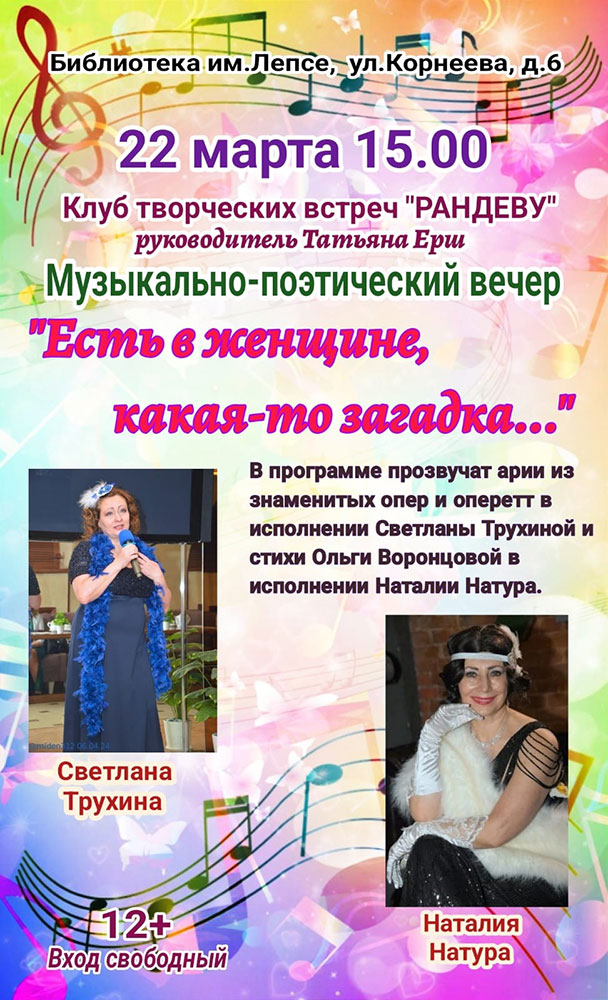Библиотека №1 им. И. И. Лепсе приглашает на Музыкально-поэтический вечер Клуба творческих встреч "Рандеву" "Есть в женщине, какая-то загадка…".