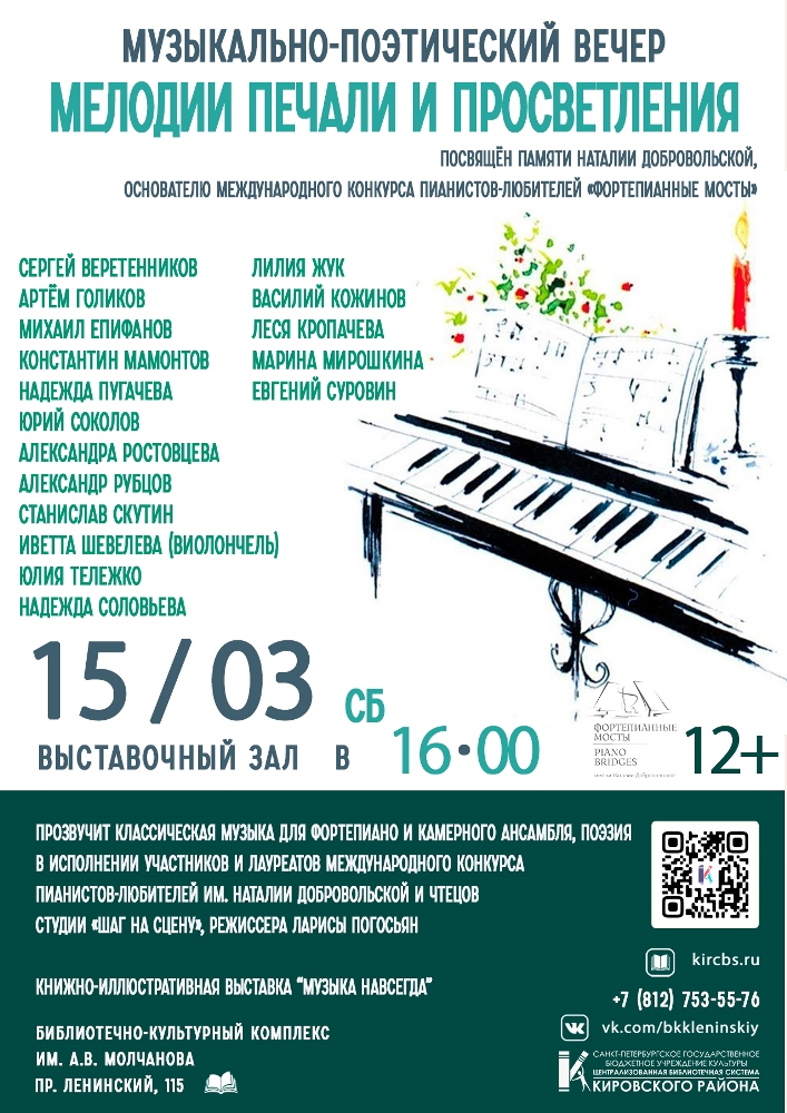 15 марта в 16.00 в Выставочном зале Библиотеки №4/ Библиотечно-культурного комплекса им. А.В. Молчанова (Ленинский пр., д. 115) состоится музыкально-поэтический вечер "Мелодии печали и просветления", посвящённый памяти Наталии Добровольской, основателю международного конкурса пианистов-любителей "Фортепианные мосты".