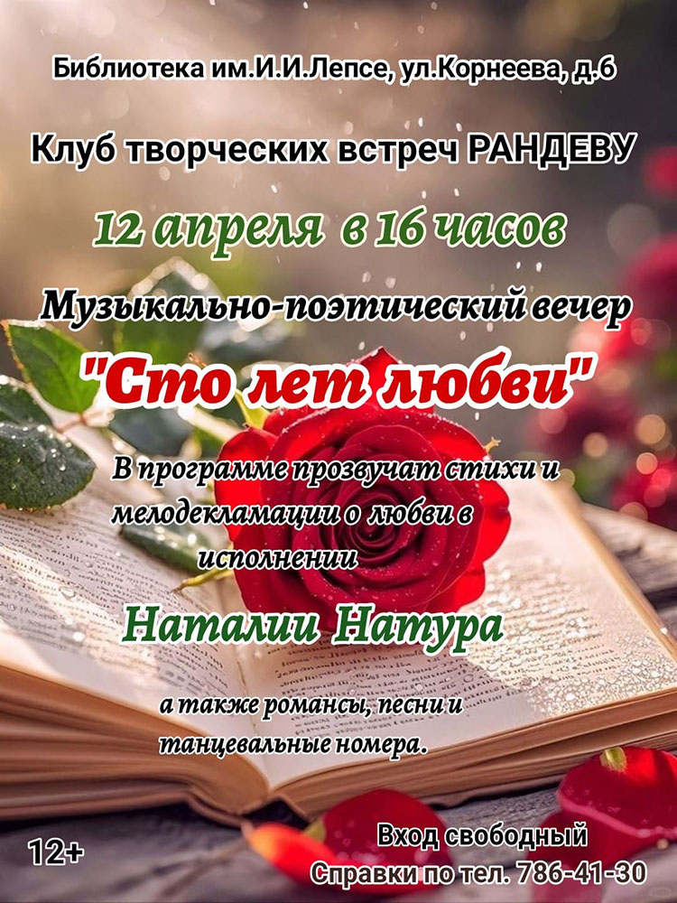 Библиотека №1 им. И. И. Лепсе приглашает на Музыкально-поэтический вечер "Сто лет любви" клуба творческих встреч "Рандеву".