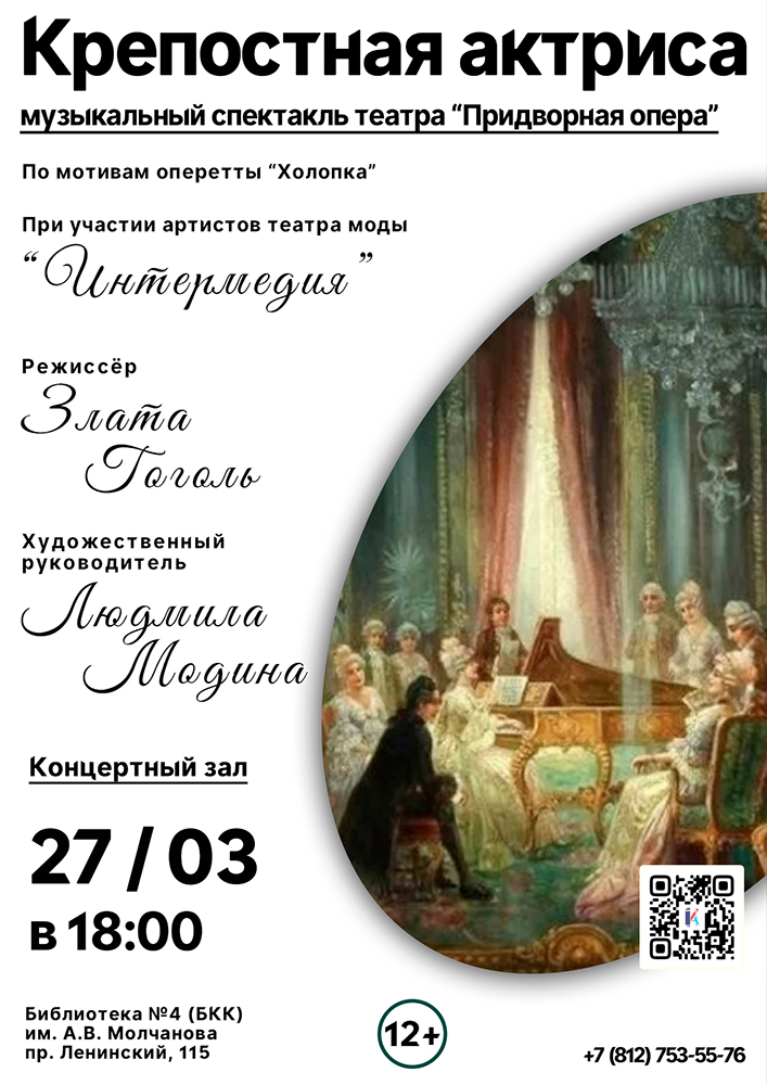 27 марта в 18.00 в Концертном зале Библиотеки №4 (Библиотечно-культурного комплекса) им. А. В. Молчанова (Ленинский пр., д. 115) состоится Музыкальный спектакль театра "Придворная опера" - "Крепостная актриса".