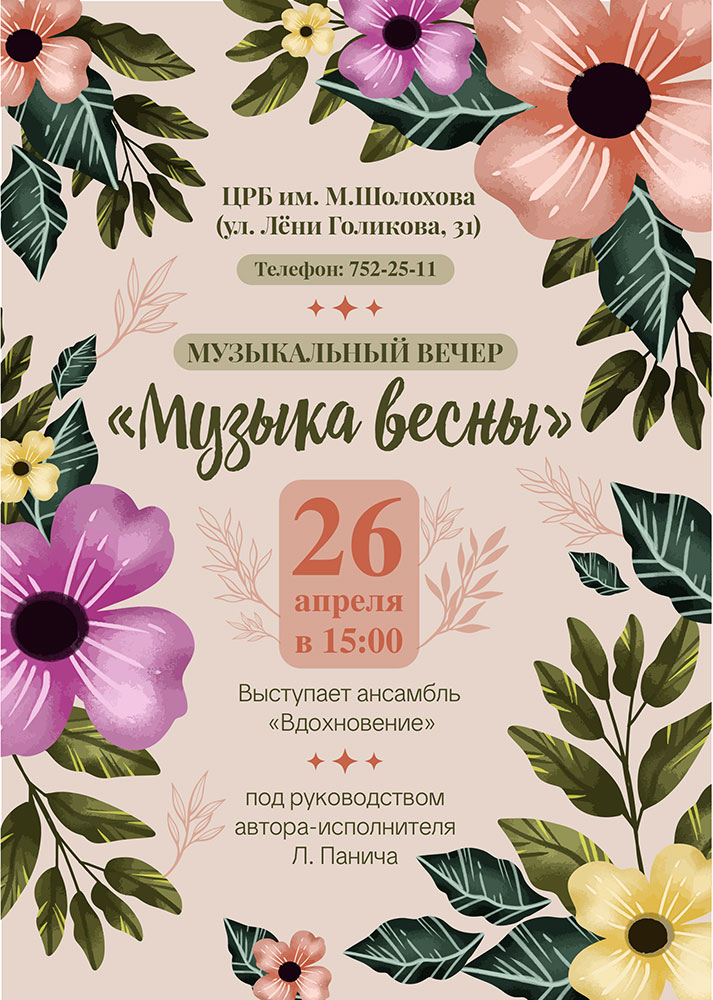В ЦРБ им. М. Шолохова состоится музыкальный вечер "Музыка весны" в исполнении ансамбля "Вдохновение" под руководством автора-исполнителя Леонида Панича. Выступают: