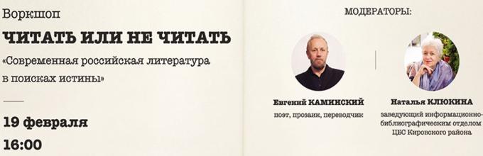 19 февраля в 16.00 в Библиотечно-культурном комплексе им. А. В. Молчанова (Ленинский пр., д. 115) состоится воркшоп "Читать или не читать" на тему "Современная российская литература в поисках истины". Ведущими-модераторами выступят русский поэт, прозаик, переводчик, автор десяти поэтических сборников,…