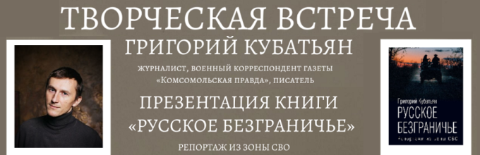 16 февраля в 16.00 в Библиотечно-культурном комплексе им. А. В. Молчанова (Ленинский пр., д. 115) состоится творческая встреча с журналистом, военным корреспондентом газеты "Комсомольская правда", писателем, путешественником, членом Русского географического общества Григорием Кубатьяном.