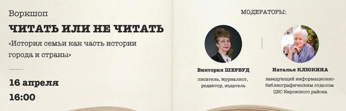 16 апреля в 16.00 в Библиотеке № 4 (Библиотечно-культурный комплекс) им. А. В. Молчанова (Ленинский пр., д. 115) состоится воркшоп "Читать или не читать" на тему "История семьи как часть истории города и страны". Ведущими-модераторами выступят журналист, сценарист, редактор, художник, член Союза журналистов…