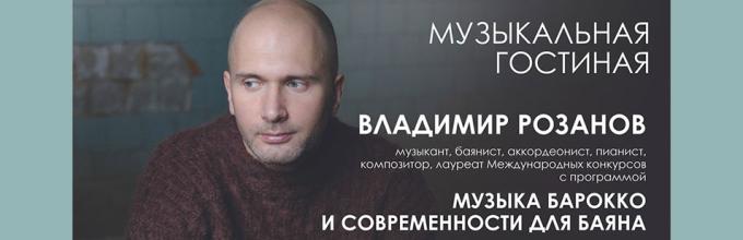 26 февраля 2026 года в 16.00 в концертном зале Библиотечно-культурного комплекса им. А. В. Молчанова (Ленинский пр., д. 115) состоится сольный концерт Владимира Розанова с программой "Музыка барокко и современности для баяна" в рамках проекта "Музыкальная гостиная".