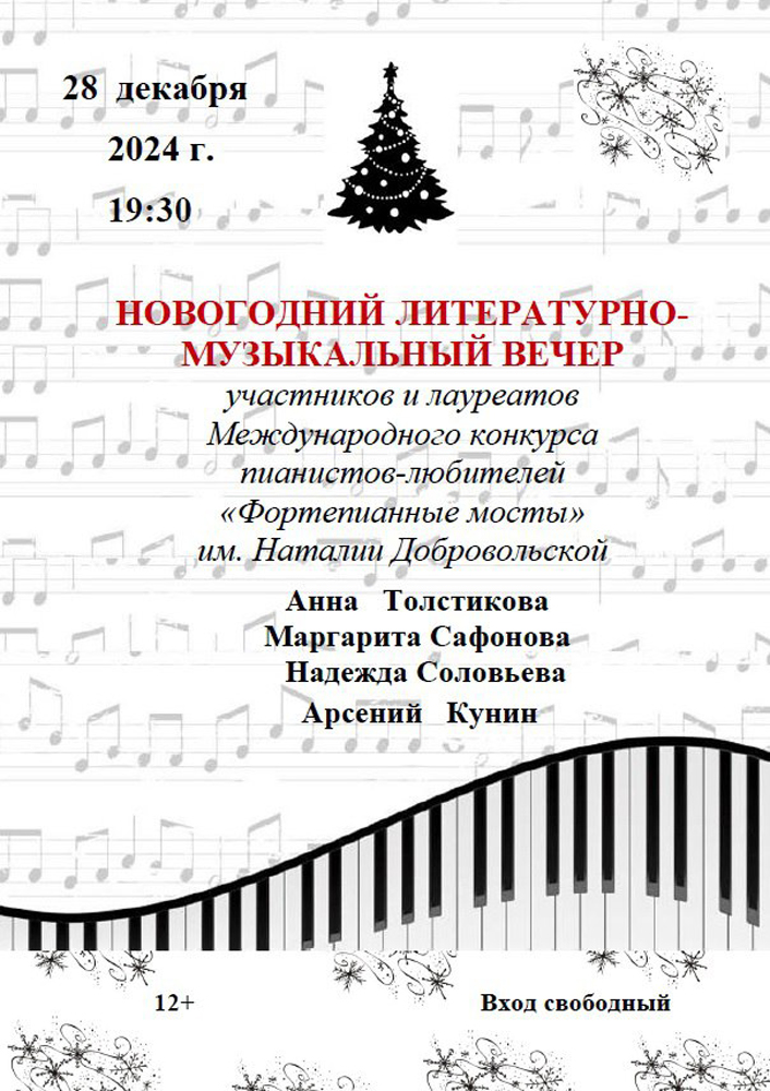 Библиотека №1 приглашает на Новогодний литературно-музыкальный вечер участников и лауреатов Международного конкурса пианистов-любителей "Фортепианные мосты" им. Наталии Добровольской.
