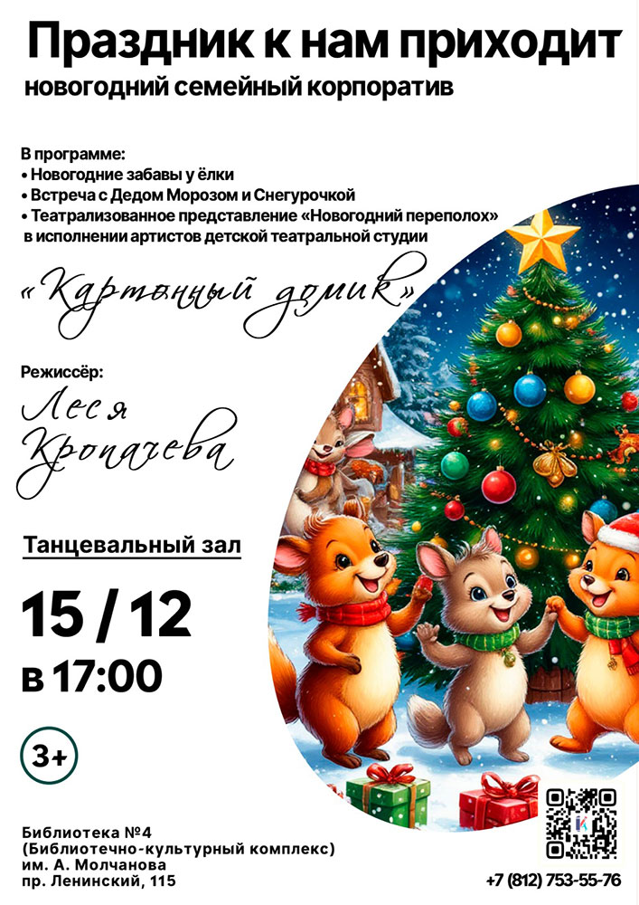 15 декабря в 17.00 в Танцевальном зале Библиотеки №4 (Библиотечно-культурного комплекса) им. А. Молчанова (Ленинский пр., д. 115) состоится Новогодний семейный корпоратив "Праздник к нам приходит".